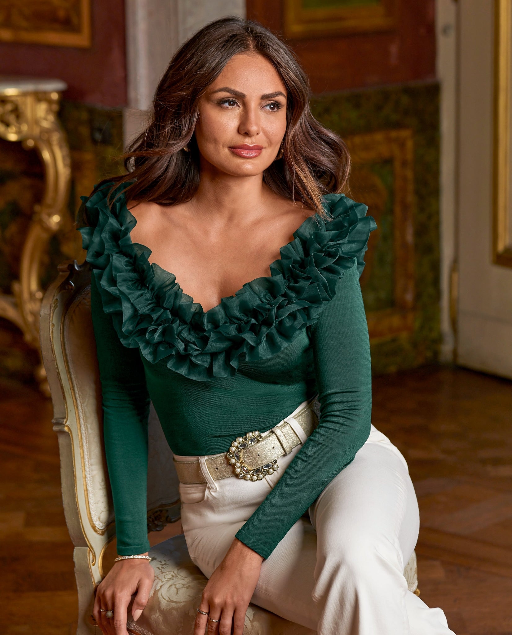 Be the first to review “Organza Ruffle V Neck Sweater Deep Emerald” Cancel reply